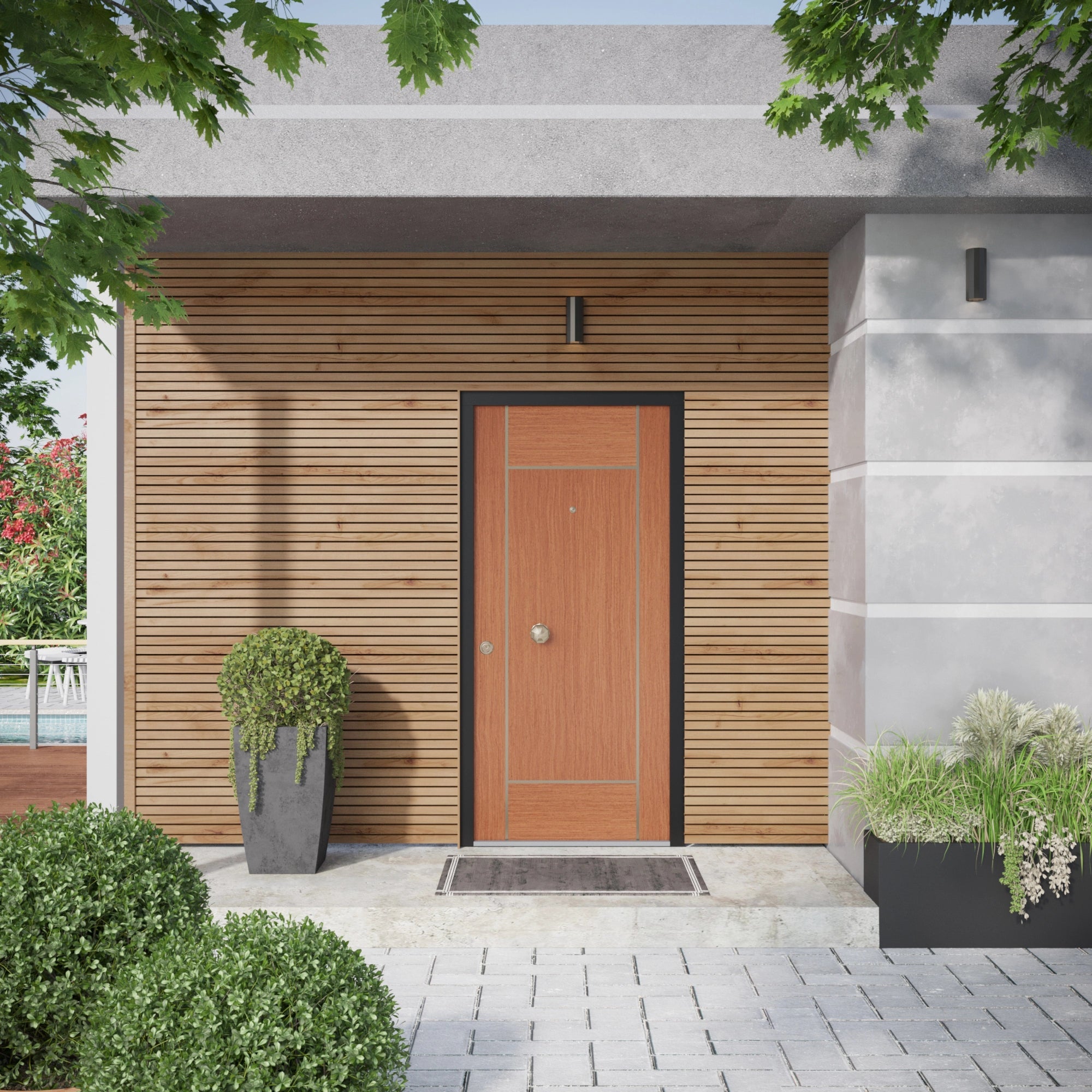 Informations sur le produit "Porte blindée bloc-porte Acier et Hydrofuge haute sécurité 3 points ou 14 points - Moderne - Pour appartement / maison - Orégon avec liserés en acier brossé"
