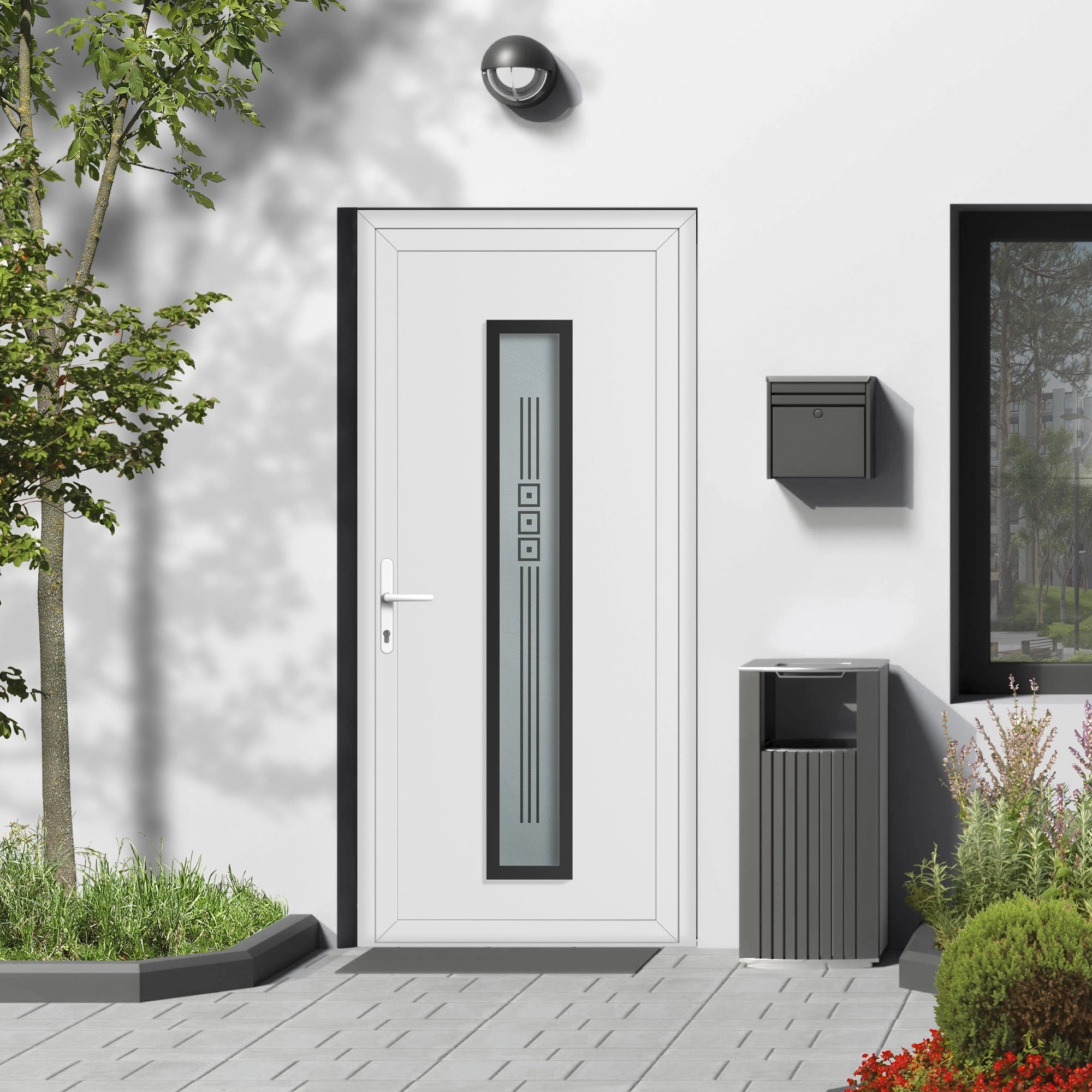 Porte d'entrée PVC vitrée sur-mesure - 3 coloris disponibles : Blanc/Gris anthracite/Chêne doré - vitrage Satiné et décoration noire