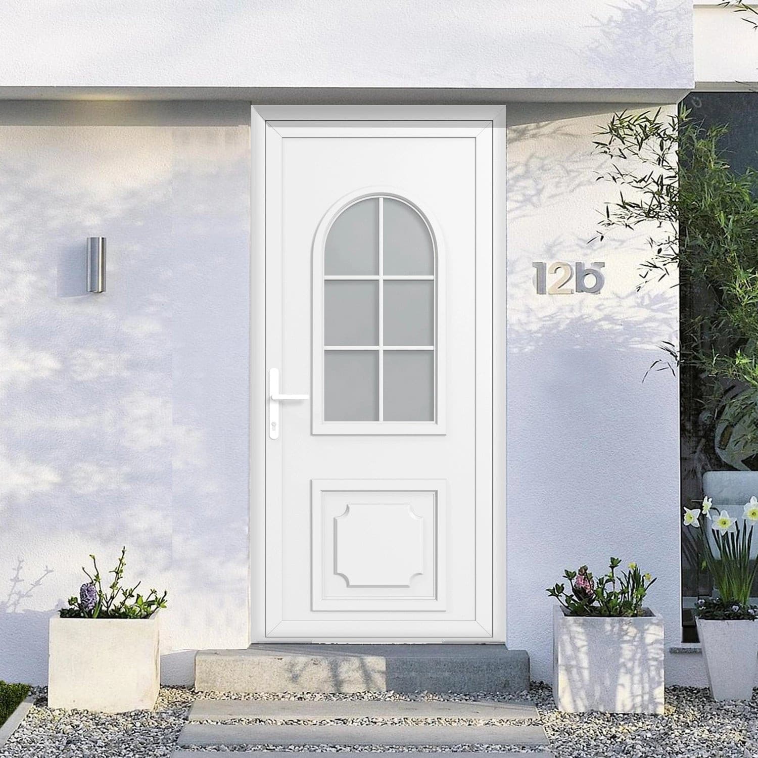 Porte d'entrée PVC vitrée sur-mesure - grand vitrage cintrée mandalin 6 carreaux - 3 coloris disponibles : Blanc/Gris anthracite/Chêne doré - vitrage Mandalin