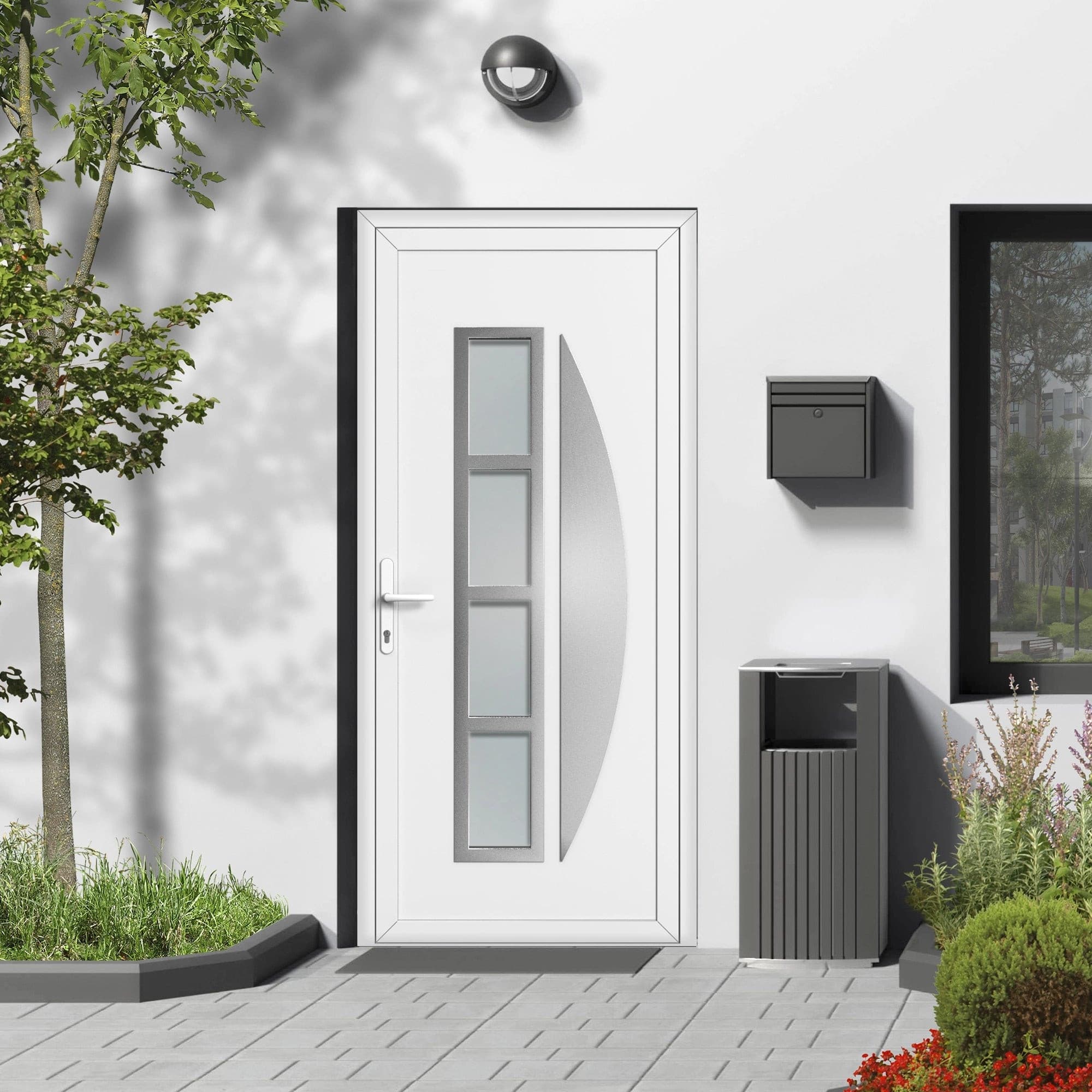 Porte d'entrée PVC vitrée sur-mesure - vitrage satiné déco Inox - Blanc/Gris anthracite/Chêne doré