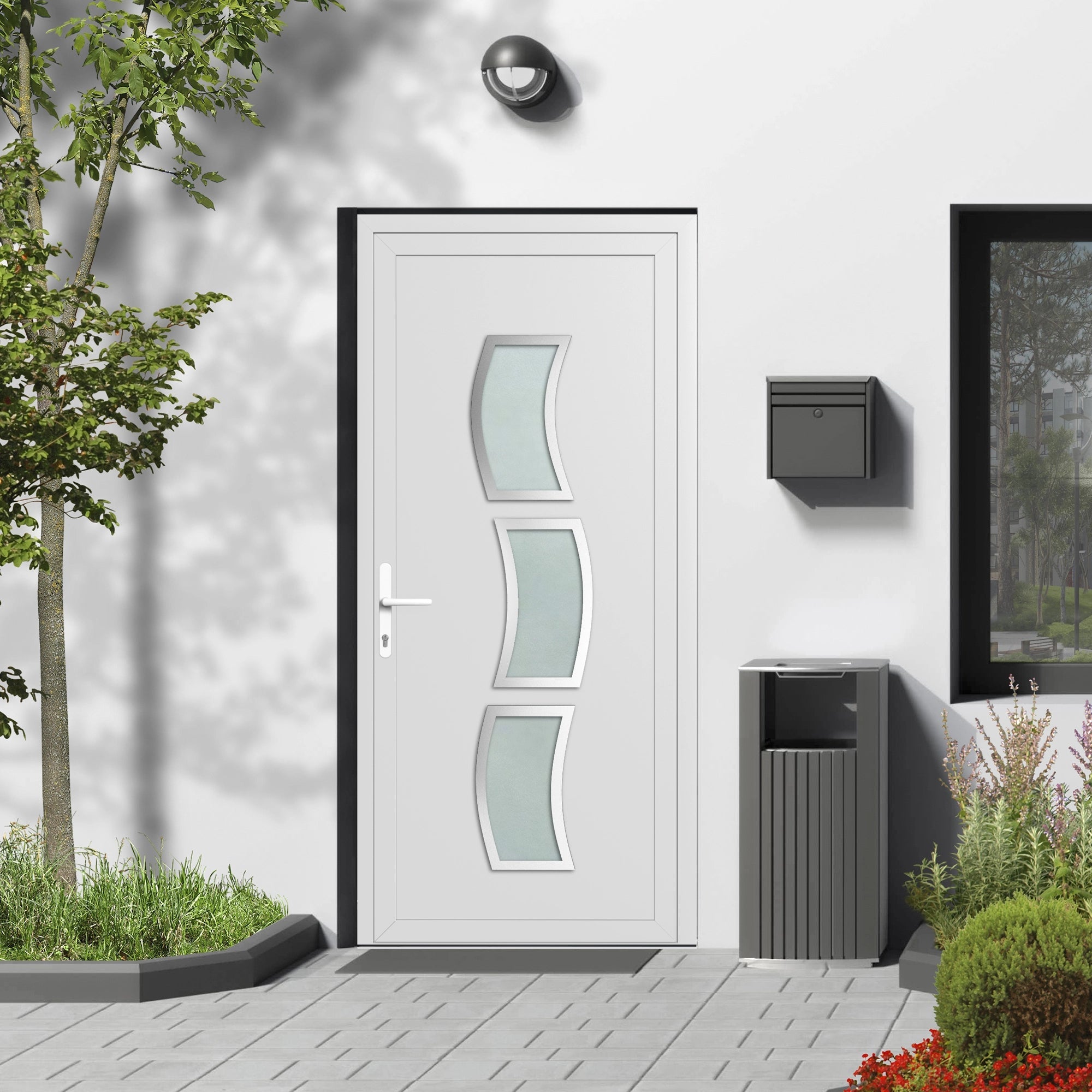 Porte d'entrée vitrée PVC blanc 3 carreaux forme vague contour Inox H 218 x L 96 cm