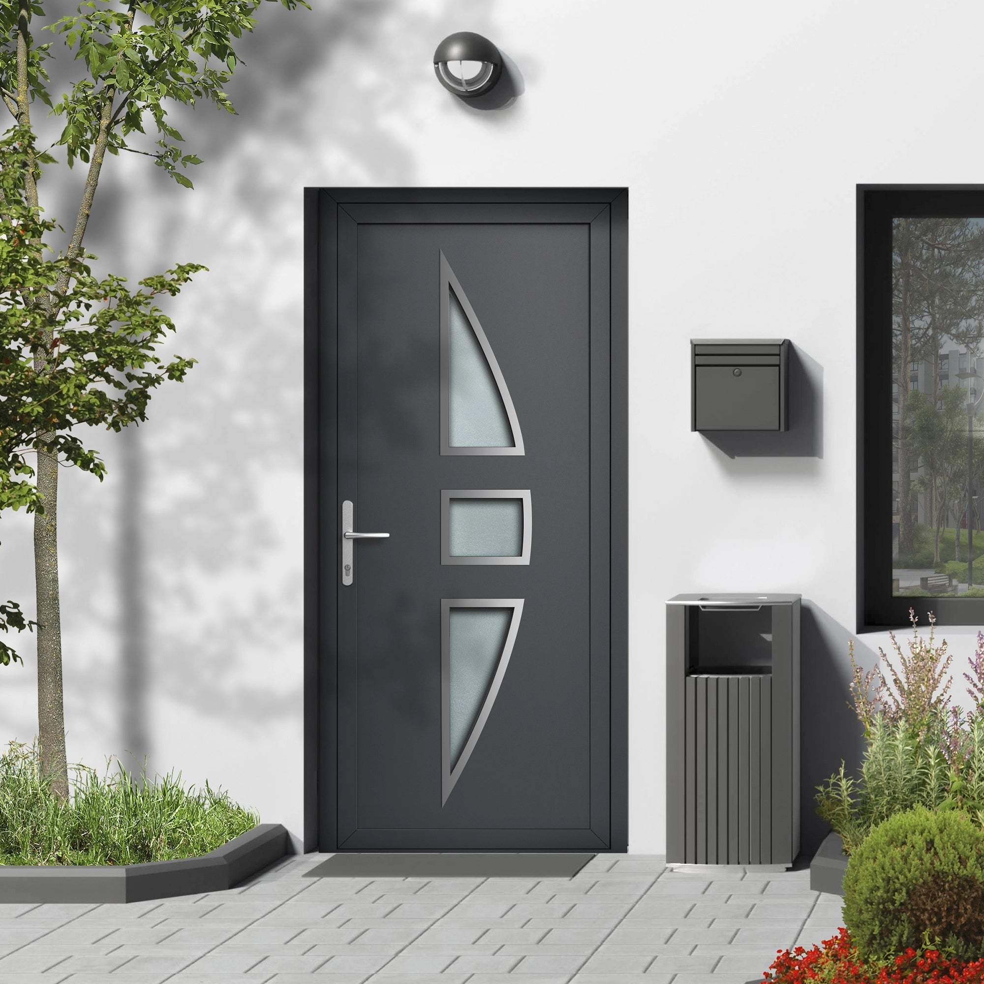 Informations sur le produit "Porte d'entrée vitrée sur-mesure en aluminium - 3 carreaux demi cercle, finition contour inox brossé, vitrage satiné - Blanc / Noir / Inox naturel / Gris anthracite"