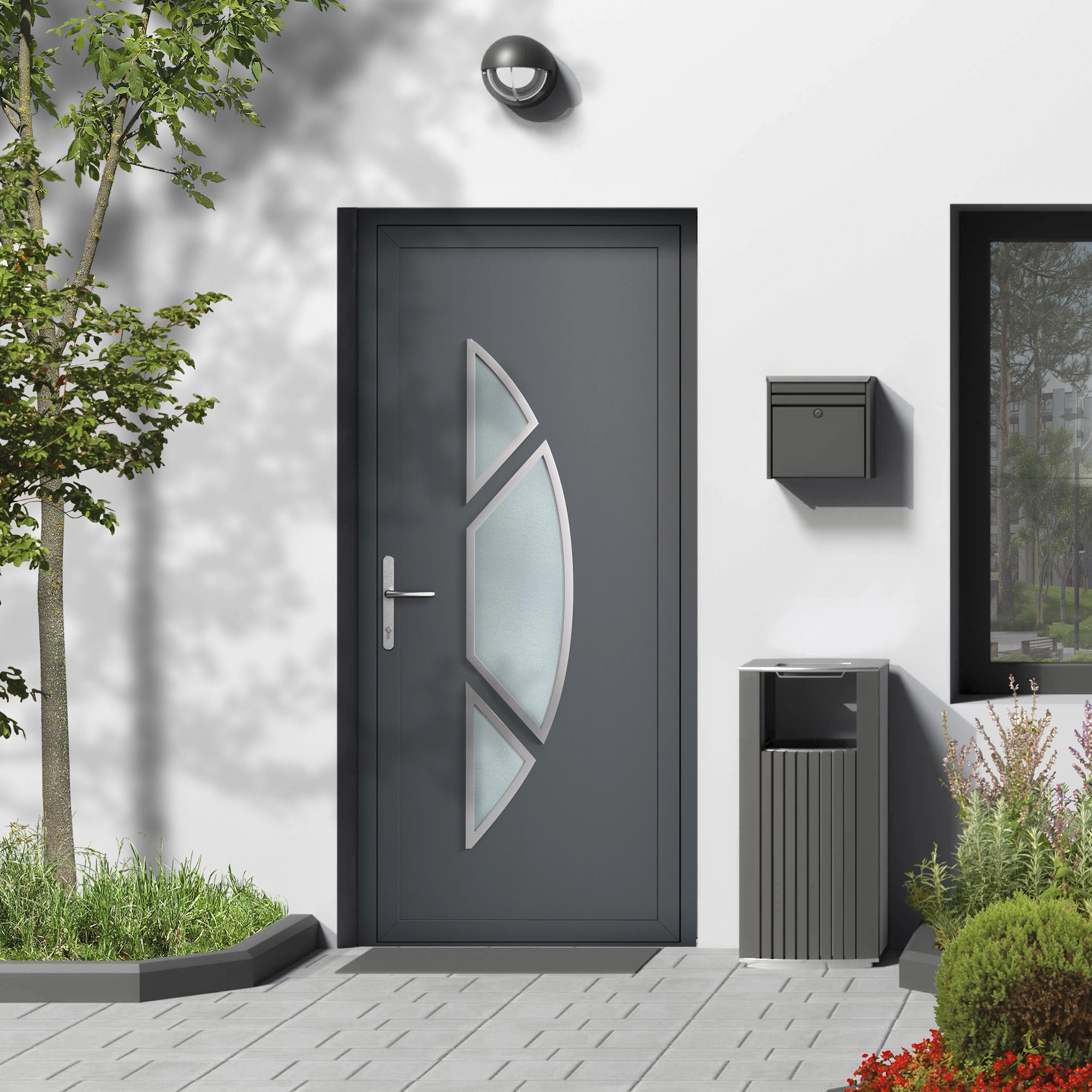 Porte d'entrée vitrée sur-mesure en aluminium - 3 carreaux demi lune, finition inox brossé, vitrage satiné - Blanc / Noir / Inox naturel / Gris anthracite