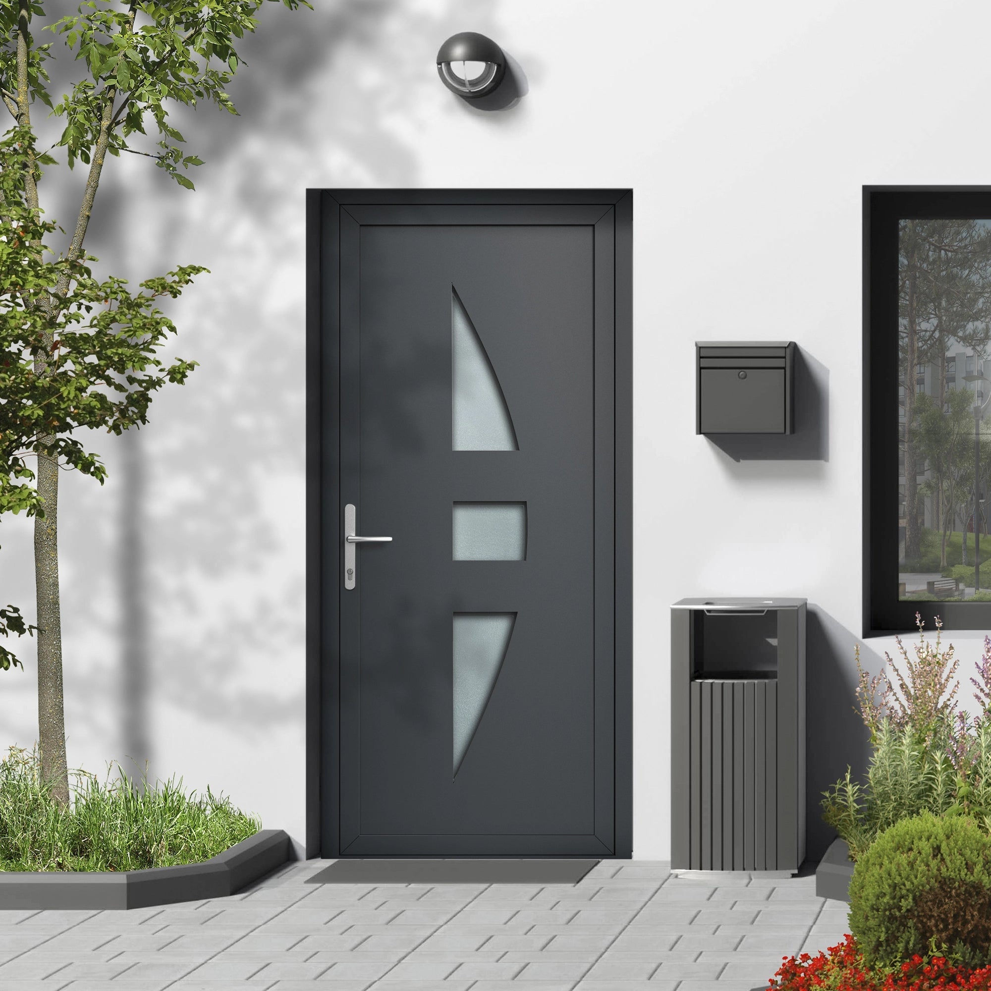 Porte d'entrée vitrée sur-mesure en aluminium - 3 carreaux demi ovale, vitrage satiné - Blanc / Noir / Inox naturel / Gris anthracite