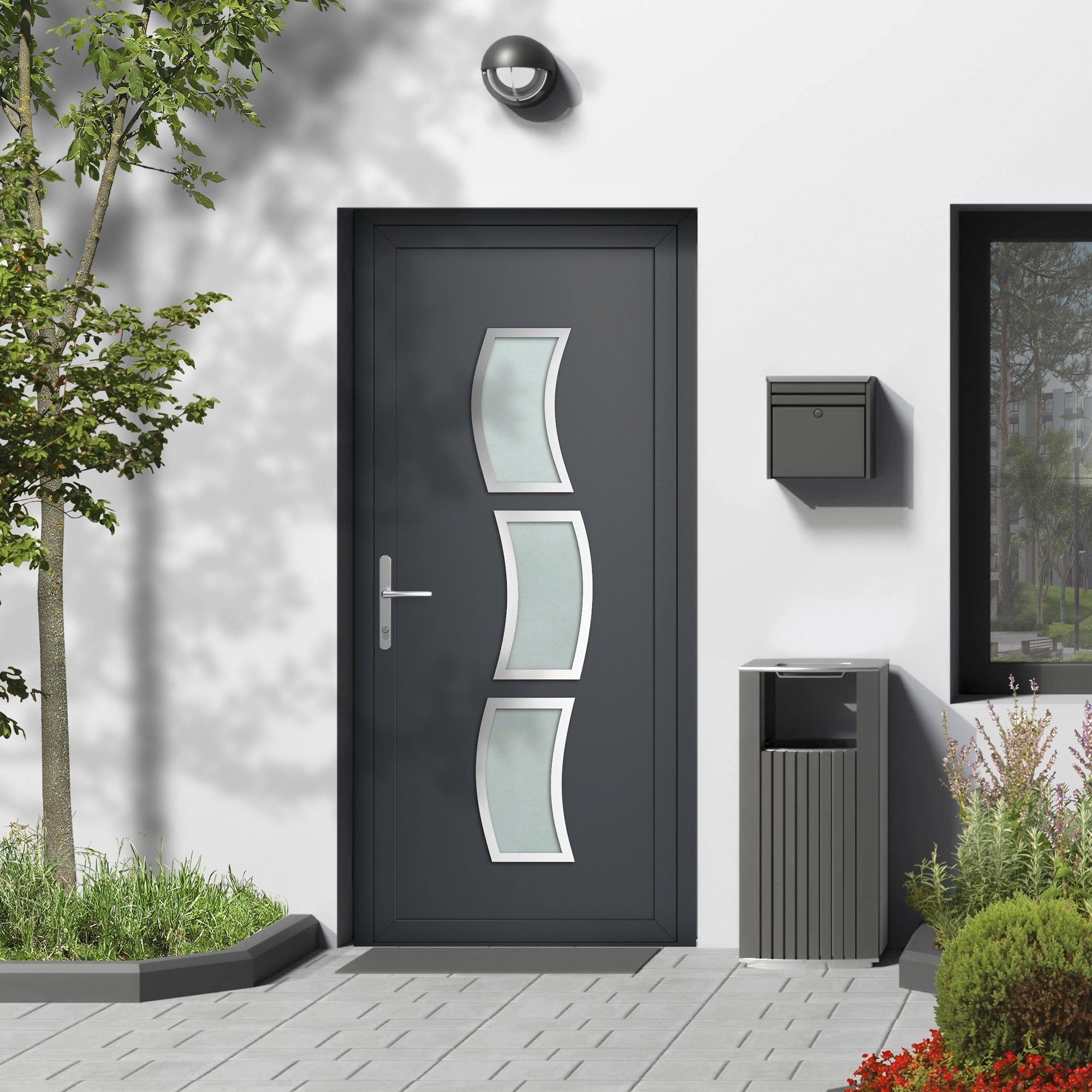 Porte d'entrée vitrée sur-mesure en aluminium - 3 carreaux en forme de vague, finition inox brossé, vitrage satiné - Blanc / Noir / Inox naturel / Gris anthracite