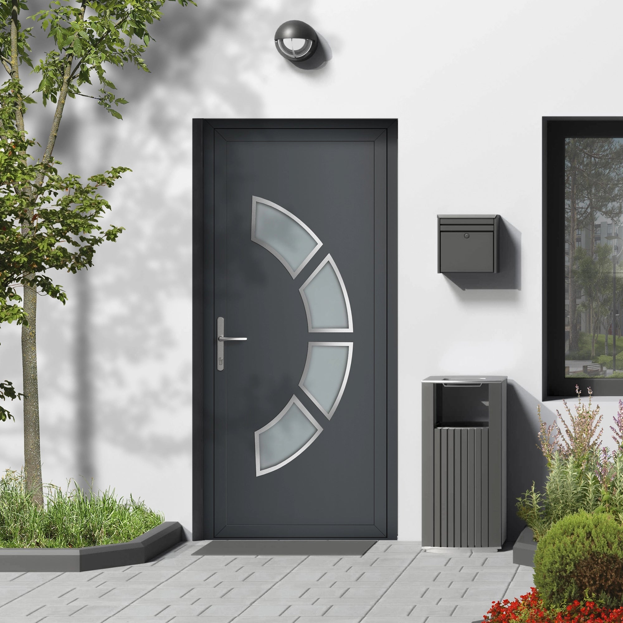 Informations sur le produit "Porte d'entrée vitrée sur-mesure en aluminium - 4 carreaux en demi cercle, finition inox brossé, vitrage satiné - Blanc / Noir / Inox naturel / Gris anthracite"