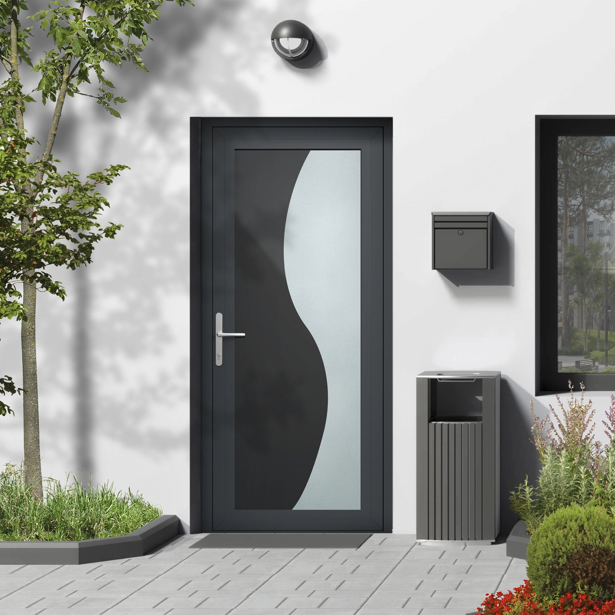 Informations sur le produit "Porte d'entrée vitrée sur-mesure en aluminium - Un vitrage pleine porte impression grapgique 3D semi noir et blanc - Blanc / Noir / Inox naturel / Gris anthracite"